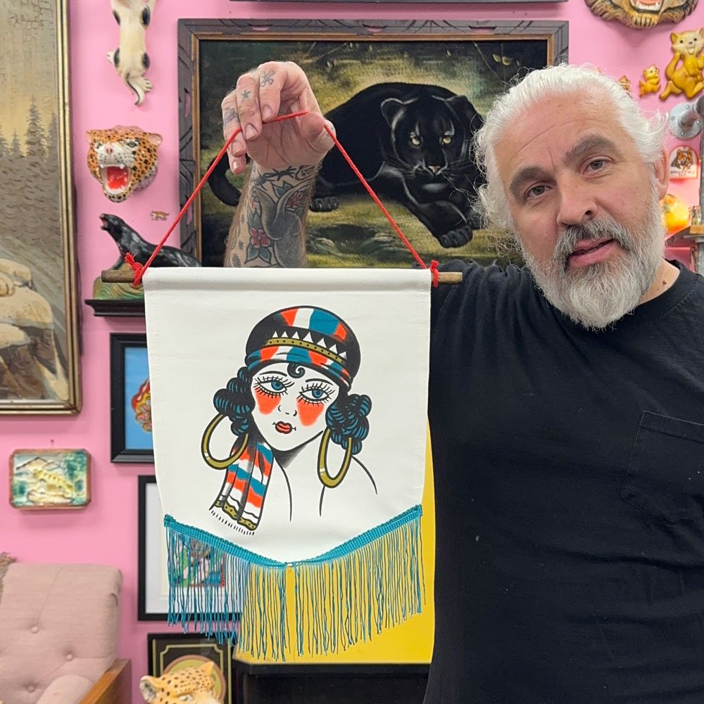 Lady Pennant. Screen printed on canvas w/ fringe Pennant and fringe approx. 10.5x16.5" + Rod, hanging rope & tassels