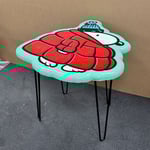 Hand cut wood, hand painted, & epoxy coated. Metal Hairpin legs