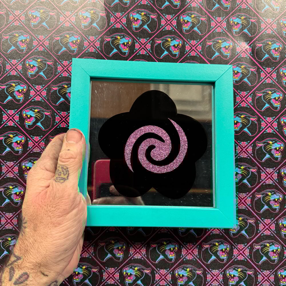 Painted on glass w/ enamel paint & glitter. framed in a repurposed frame.