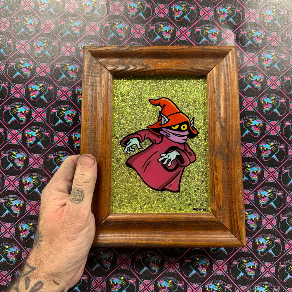 Painted on glass w/ enamel paint & glitter. framed in a repurposed vintagewood frame.