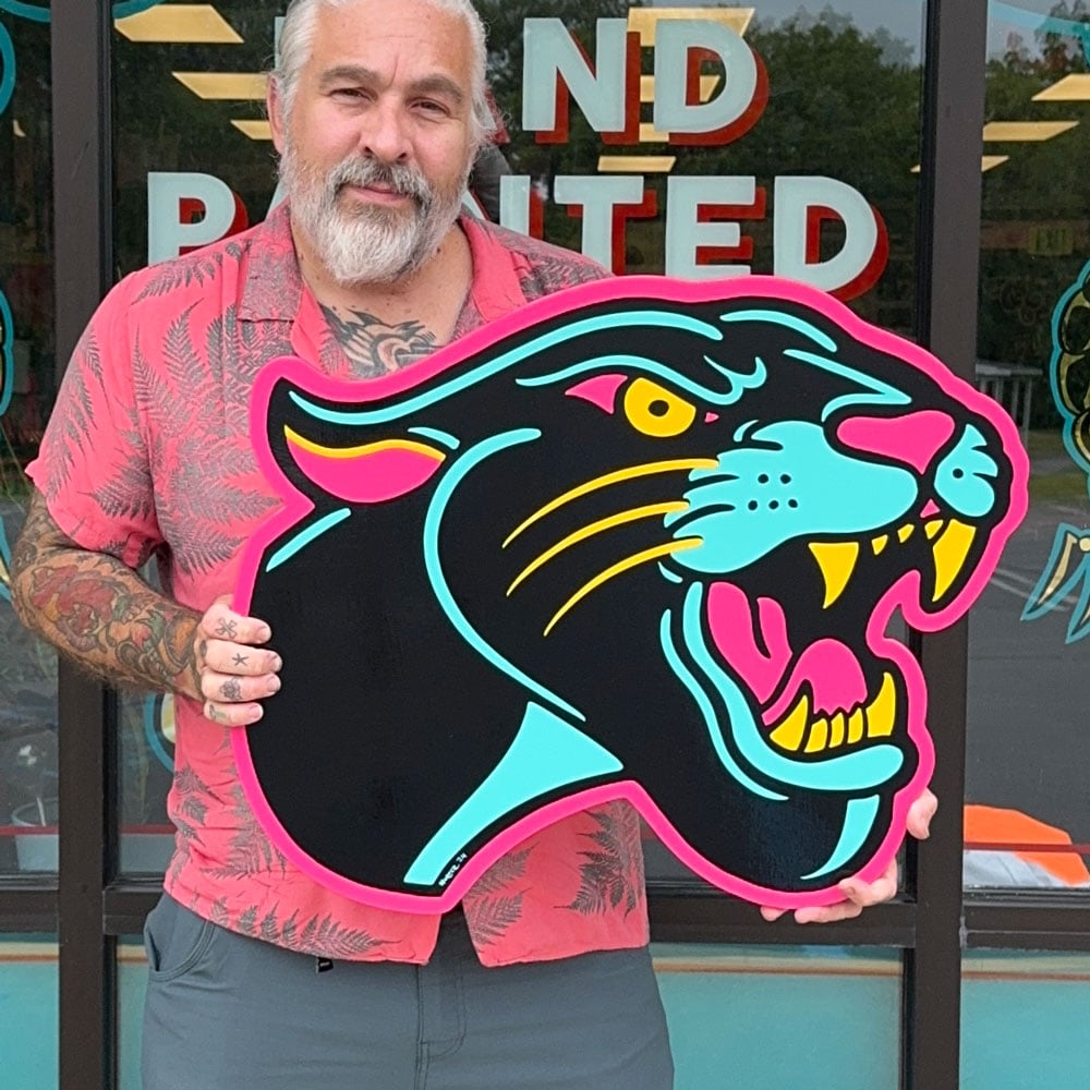 Hand painted wood cut out sign.