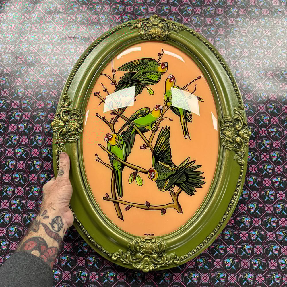 Painted on glass w/ enamel paint. framed in a repurposed antique frame.