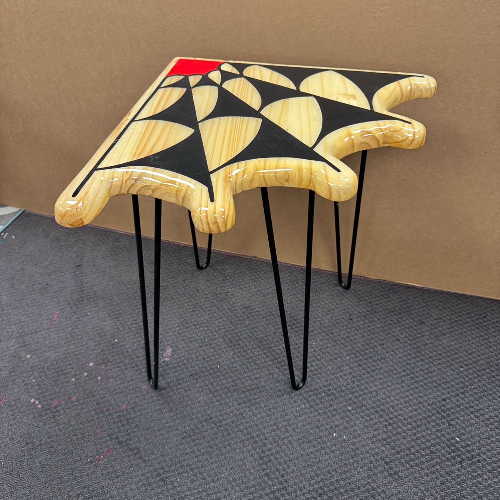 Hand cut wood, stained, hand painted, & epoxy coated. Metal hairpin legs